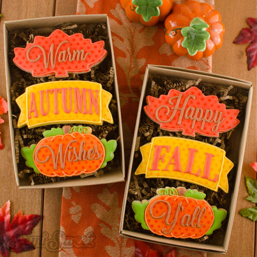 This autumn-themed mini cookie cutter set includes 4 designs: a fox with a scarf, an autumn letters plaque, an acorn, and a maple leaf.