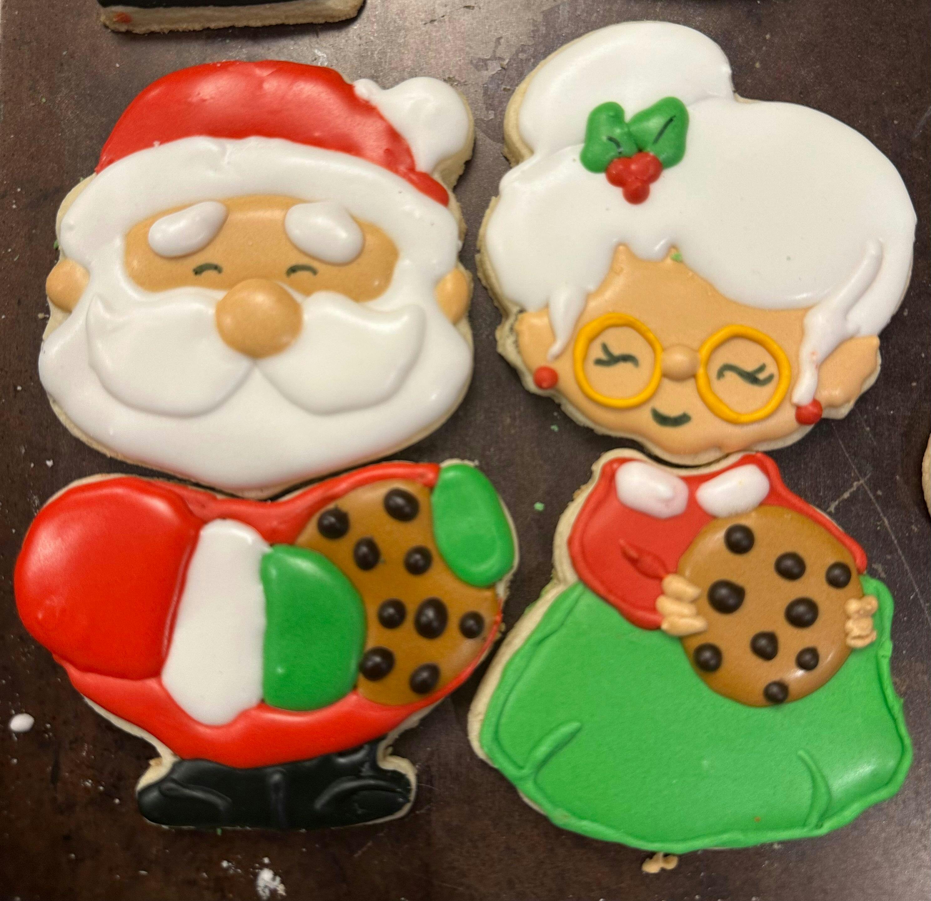This Cookie Claus Couple Cutter Set includes 4 cookie cutters: a Santa Head, a Santa Cookie Body, a Mrs. Claus head, and a Mrs. Claus Cookie Body.