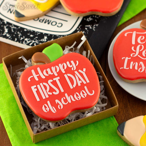 Get your kids excited for the new school year with this 3-Pc Apple Plaque Cookie Cutter & Stencils Bundle! The apple-shaped cutter makes for fun cookies, while the two included stencils add inspiring phrases like "Happy First Day of School" and "Teach Love Inspire." Perfect for decorating and making the return back to school special!