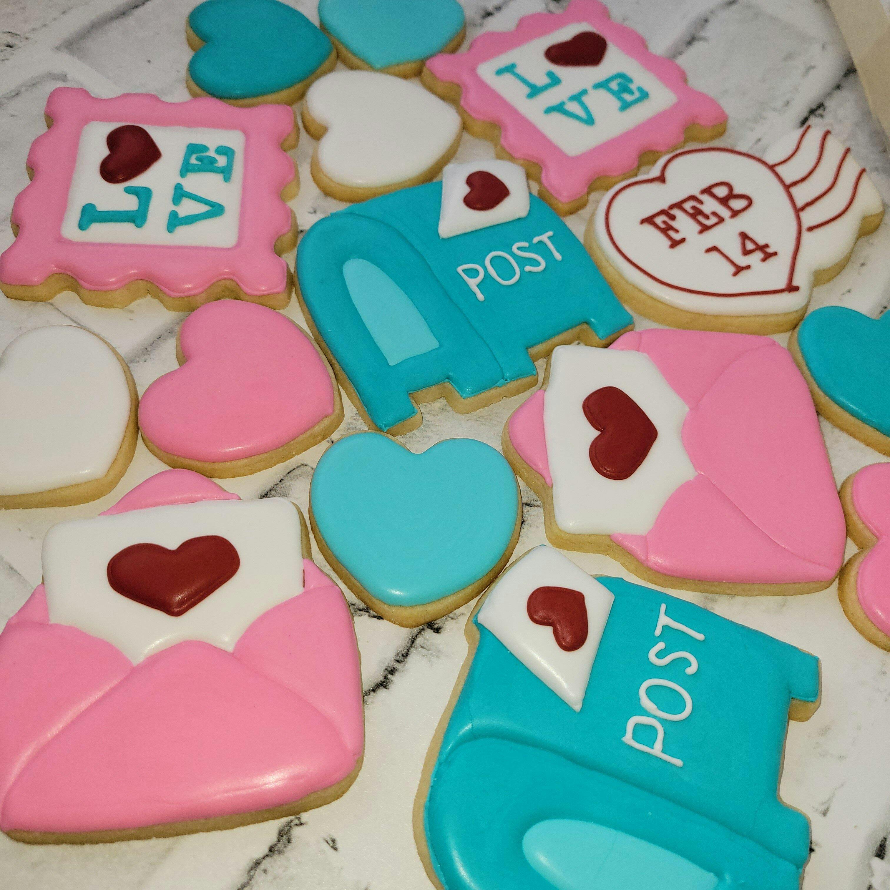 This Valentine mail cookie cutter set includes designs of a mailbox, a love letter envelope, a Valentine stamp, and a Valentine postmark.