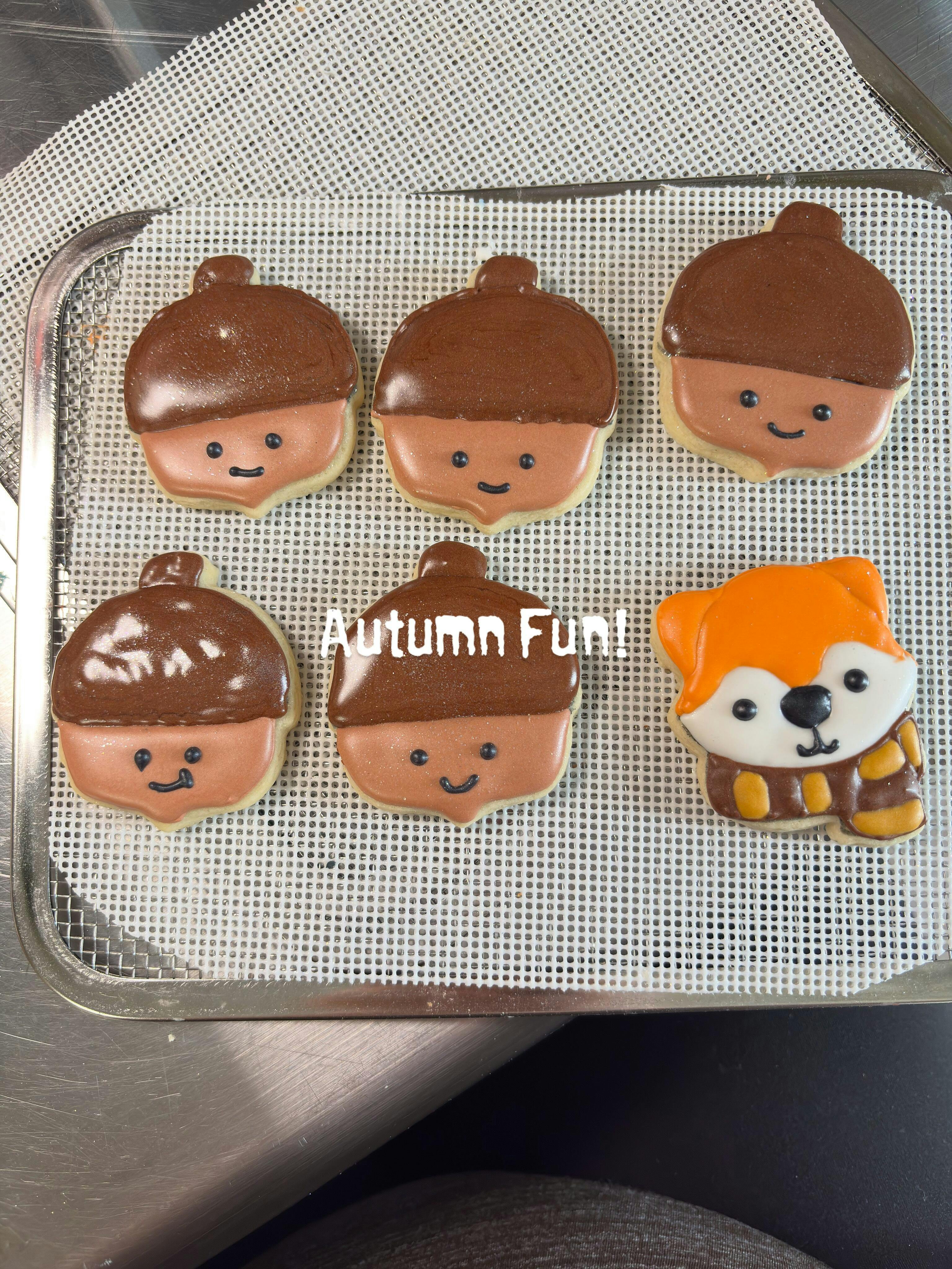 This autumn-themed mini cookie cutter set includes 4 designs: a fox with a scarf, an autumn letters plaque, an acorn, and a maple leaf.