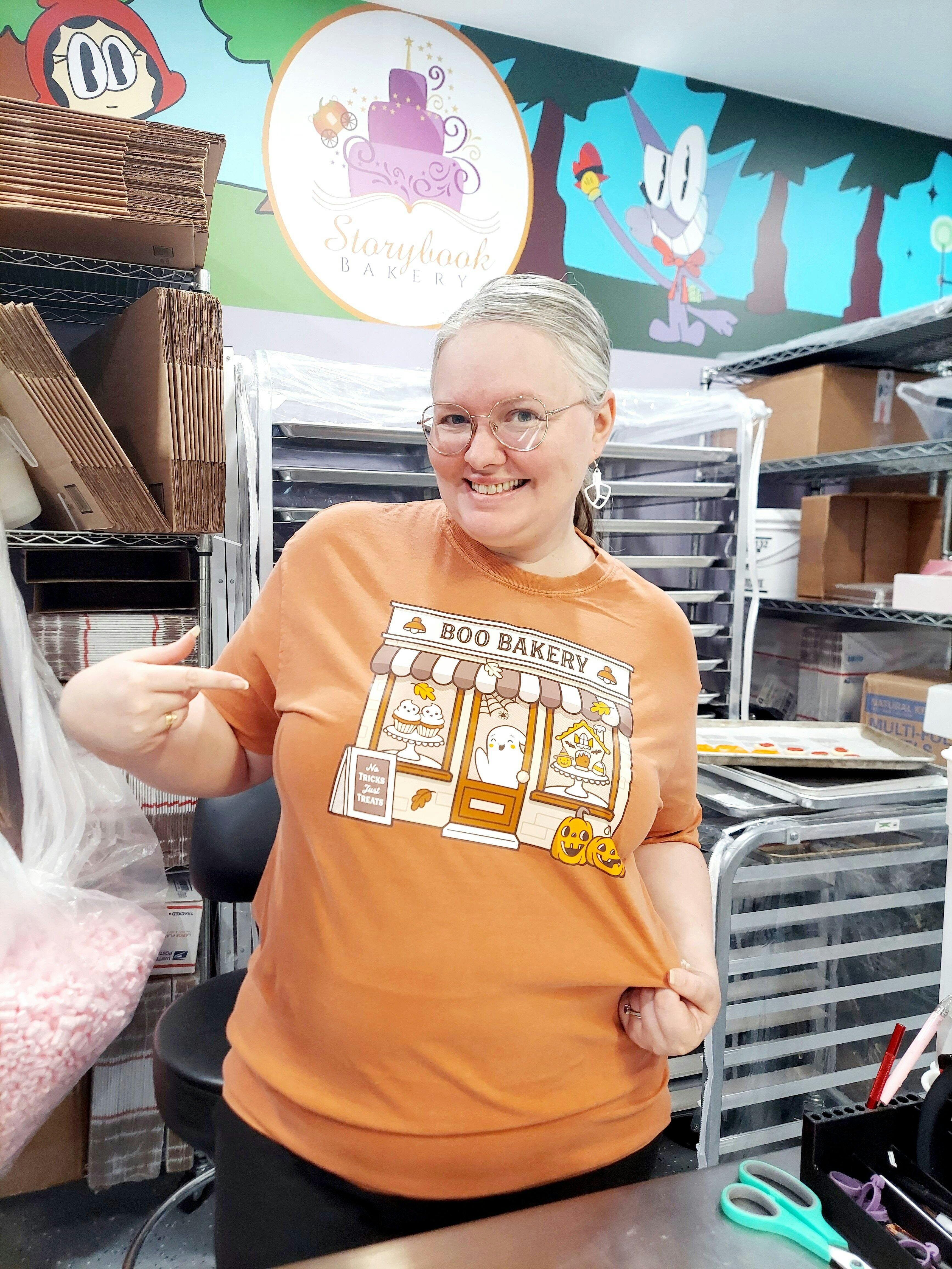Indulge in spooky style with our Boo Bakery Storefront t-shirt! Featuring a charming graphic of a ghost inside a bakery with Halloween treats, this unisex shirt is perfect for Halloween lovers and foodies alike. Get yours now and show off your unique sense of humor (and fashion)!