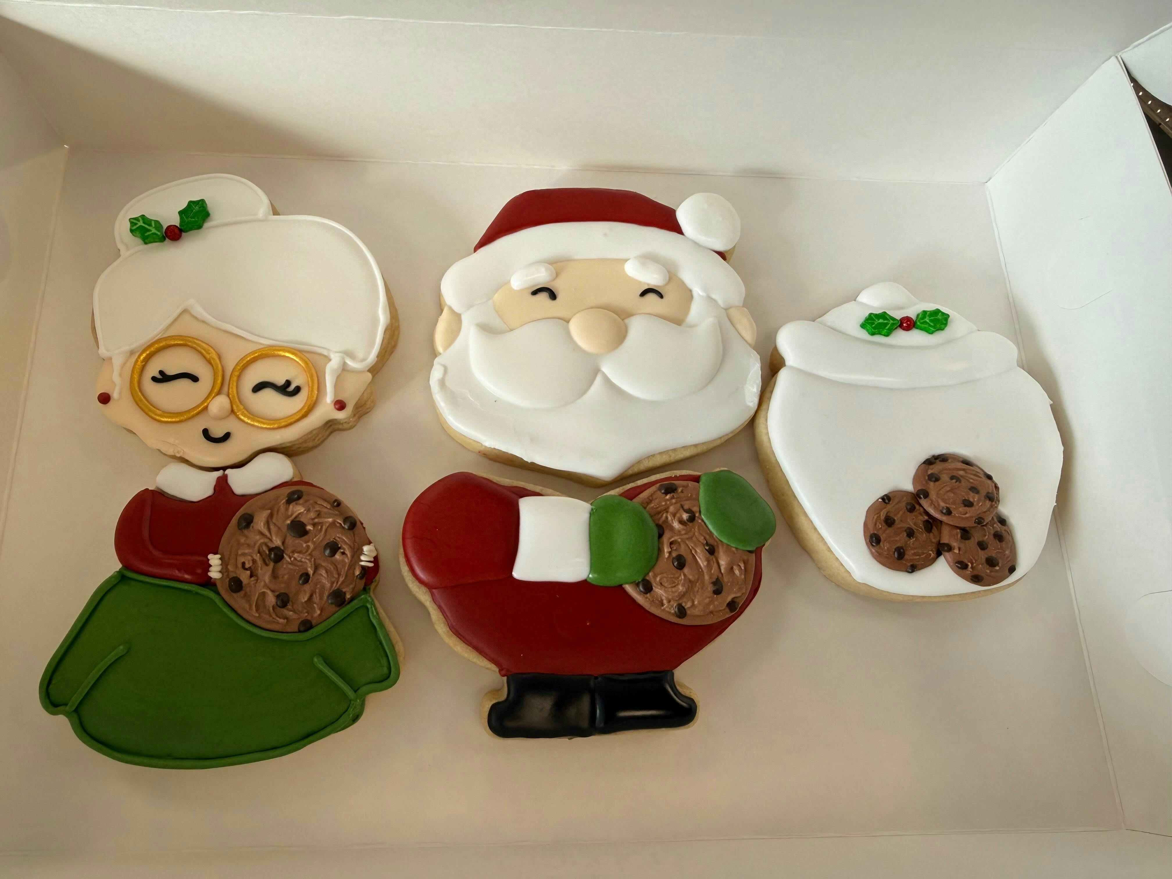 This Cookie Claus Couple Cutter Set includes 4 cookie cutters: a Santa Head, a Santa Cookie Body, a Mrs. Claus head, and a Mrs. Claus Cookie Body.