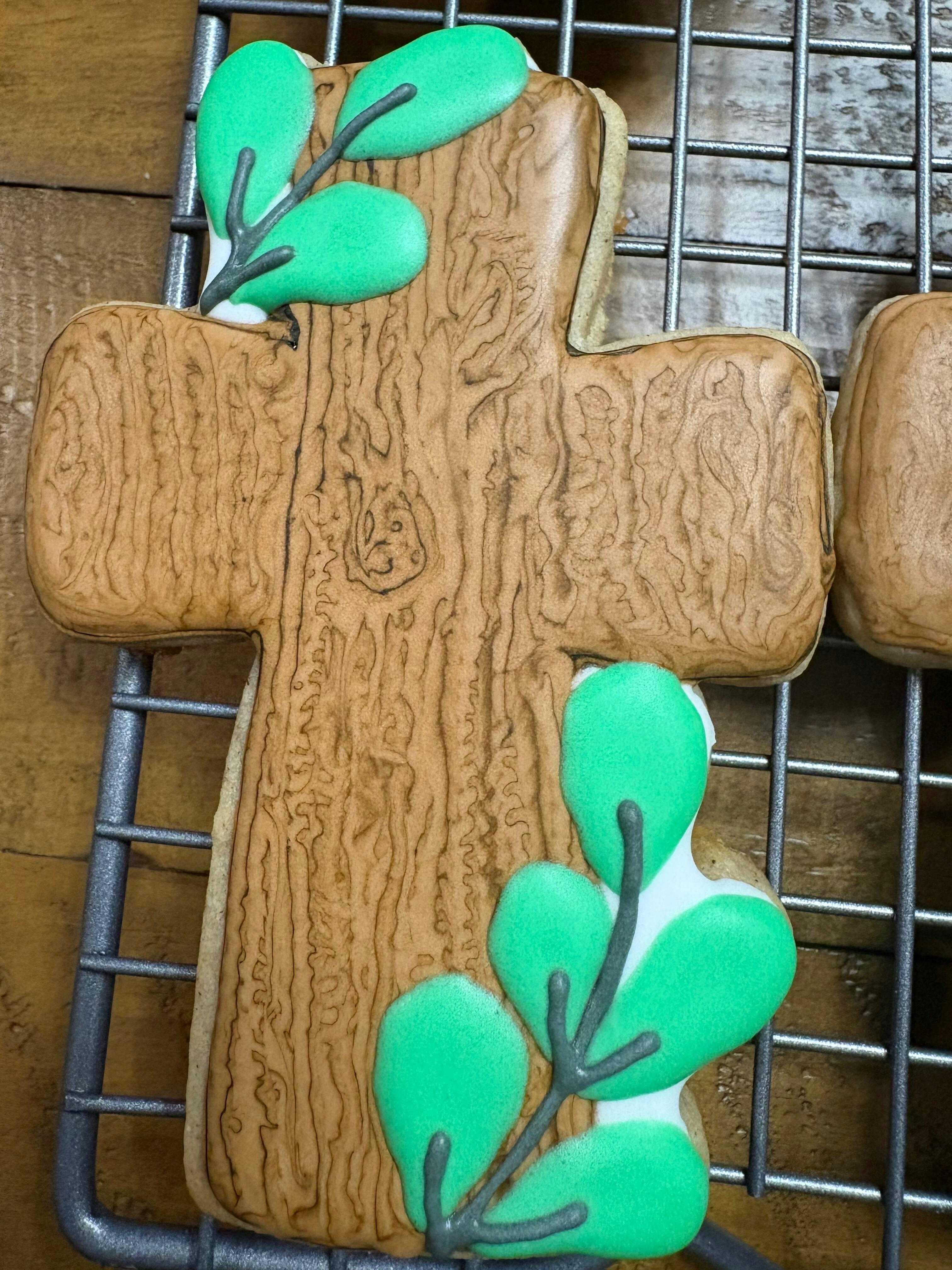 This cross with greenery cookie cutter pairs well with this stacked banner ribbon cookie cutter.