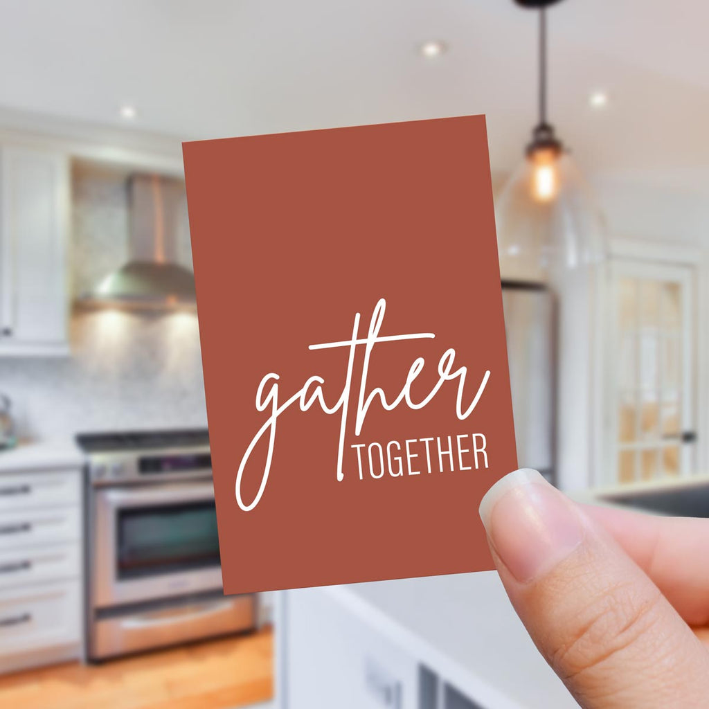 Pack of 25 pre-printed, full color, double-sided gift tags. Front and back have different designs, as referenced in the product images. One side says "Gather Together" and the other says "So Very Thankful."