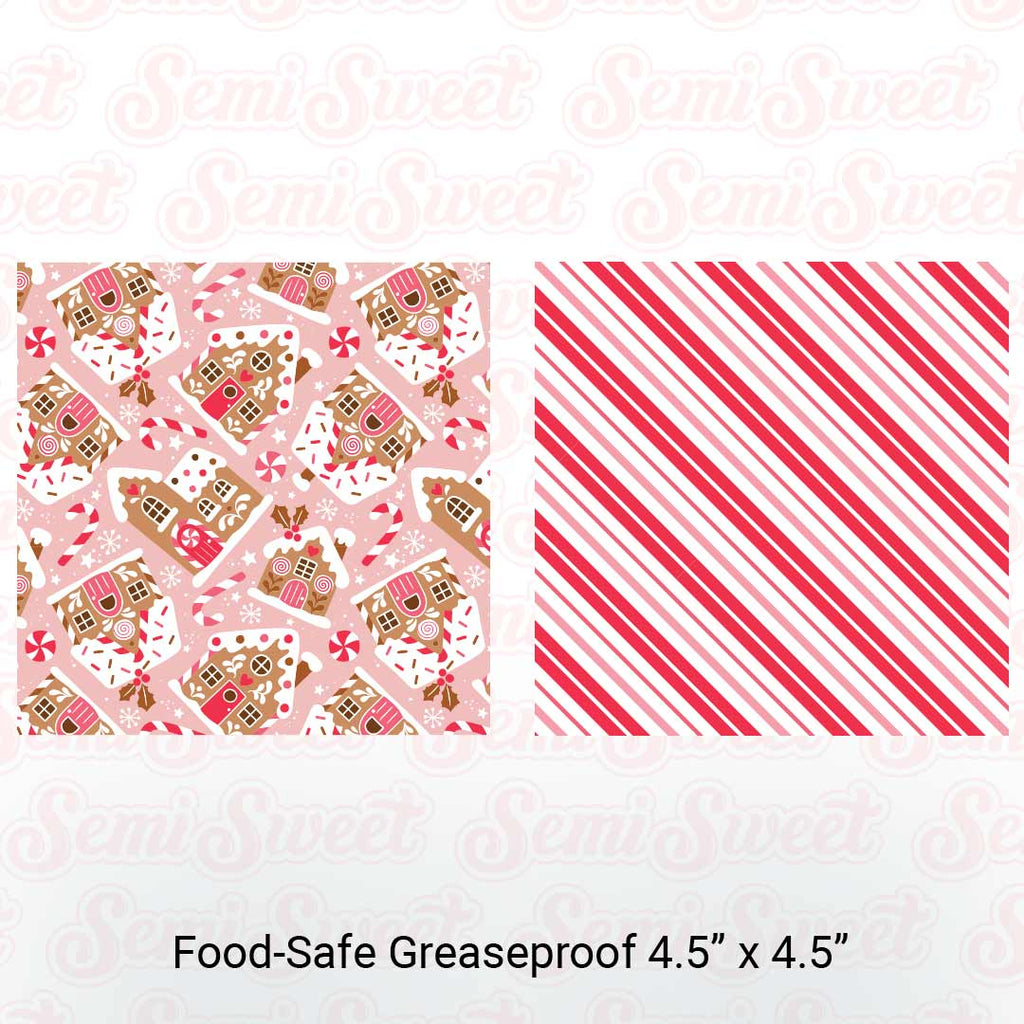 One side features a gingerbread house pattern, while the reverse side is a candy cane stripe pattern — great for Christmas treats.