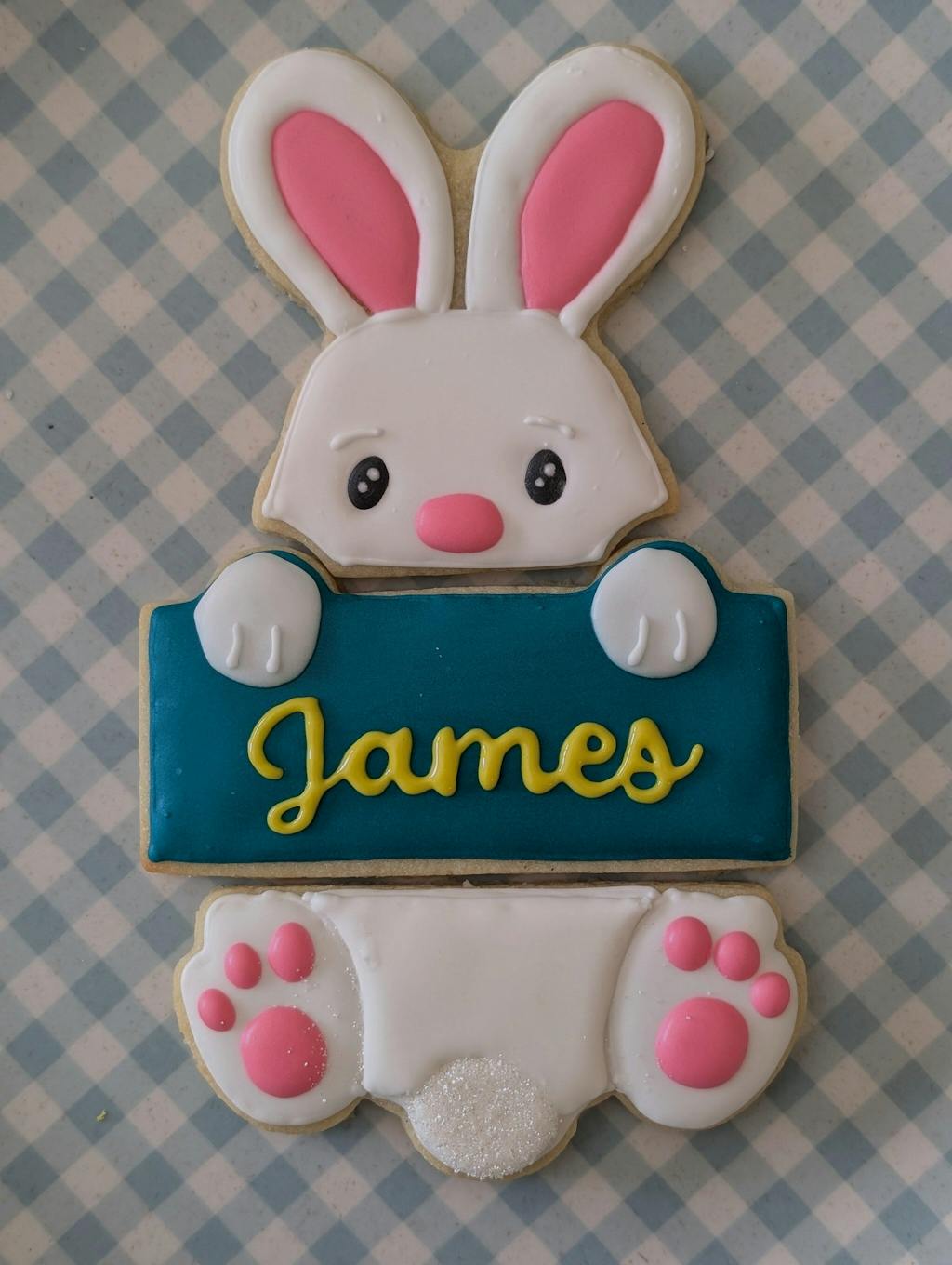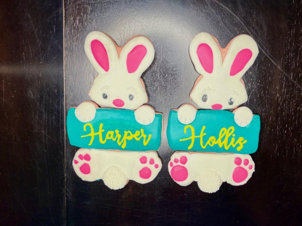 This cookie cutter set includes 3 pieces of a bunny hanging from a plaque. Great for a personalized gift.