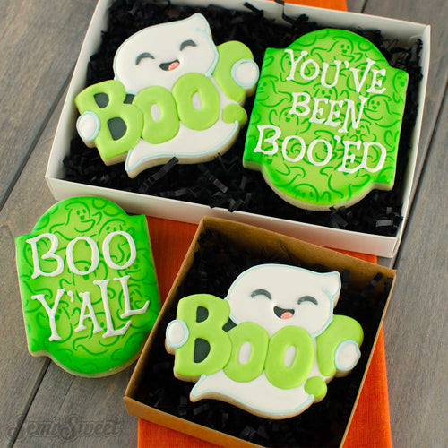 The haunted house cookies shown will fit in these great 4"x4" gift boxes.