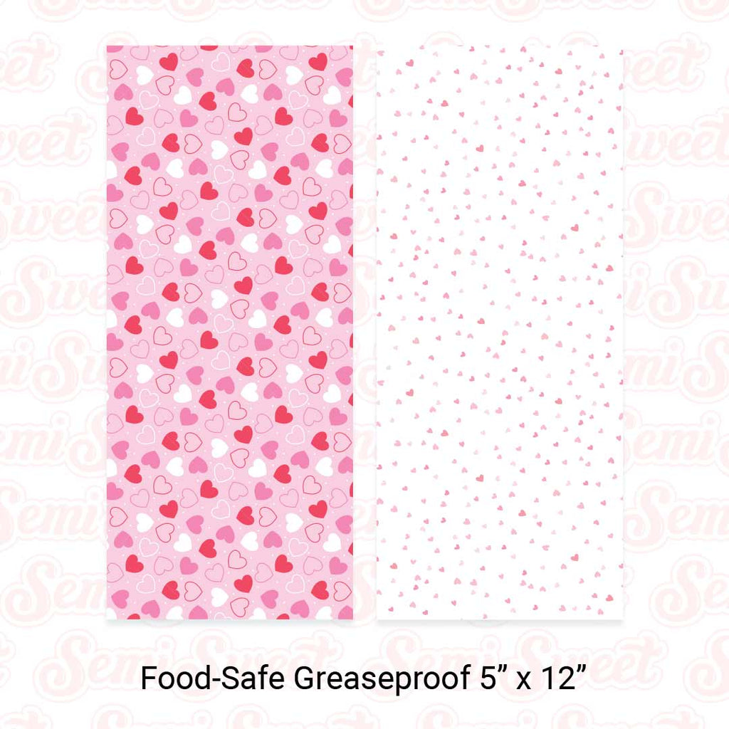 One side features a hearts pattern, while the reverse side is a tiny hearts pattern — great for Valentine's Day treats.