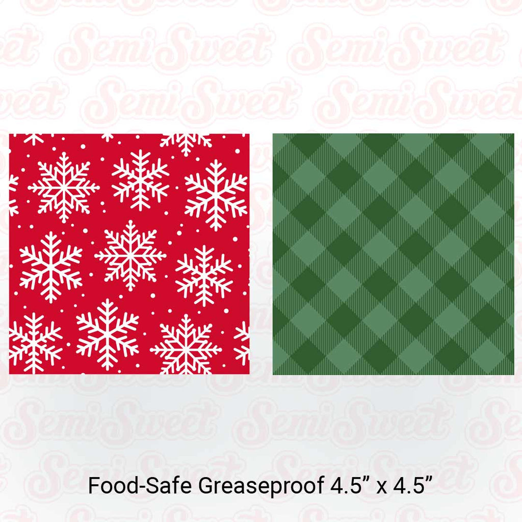One side features a snowflake pattern, while the reverse side is a green gingham stripe pattern — great for Christmas treats.