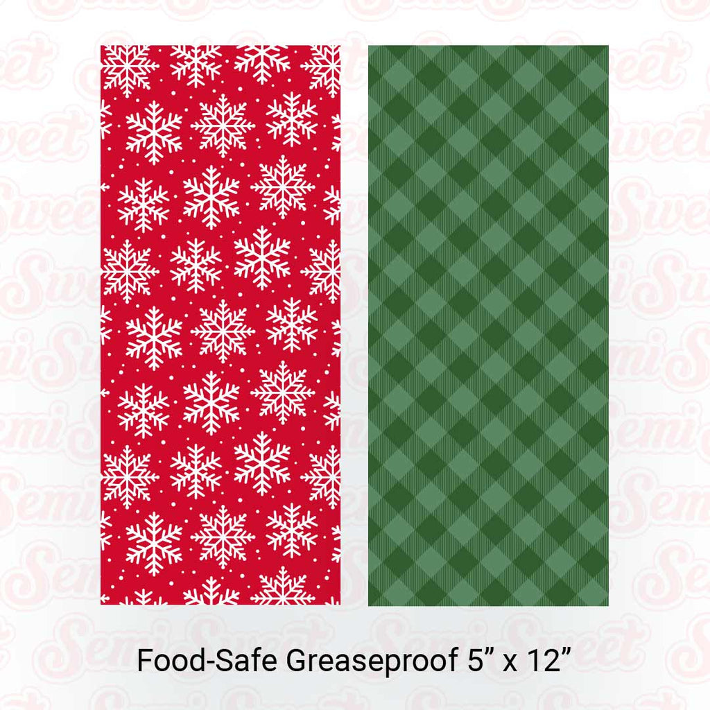 One side features a snowflake pattern, while the reverse side is a green gingham stripe pattern — great for Christmas treats.