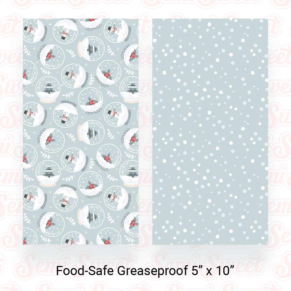 One side features a snow globe pattern, while the reverse side is a falling snow pattern — great for Christmas or winter treats.