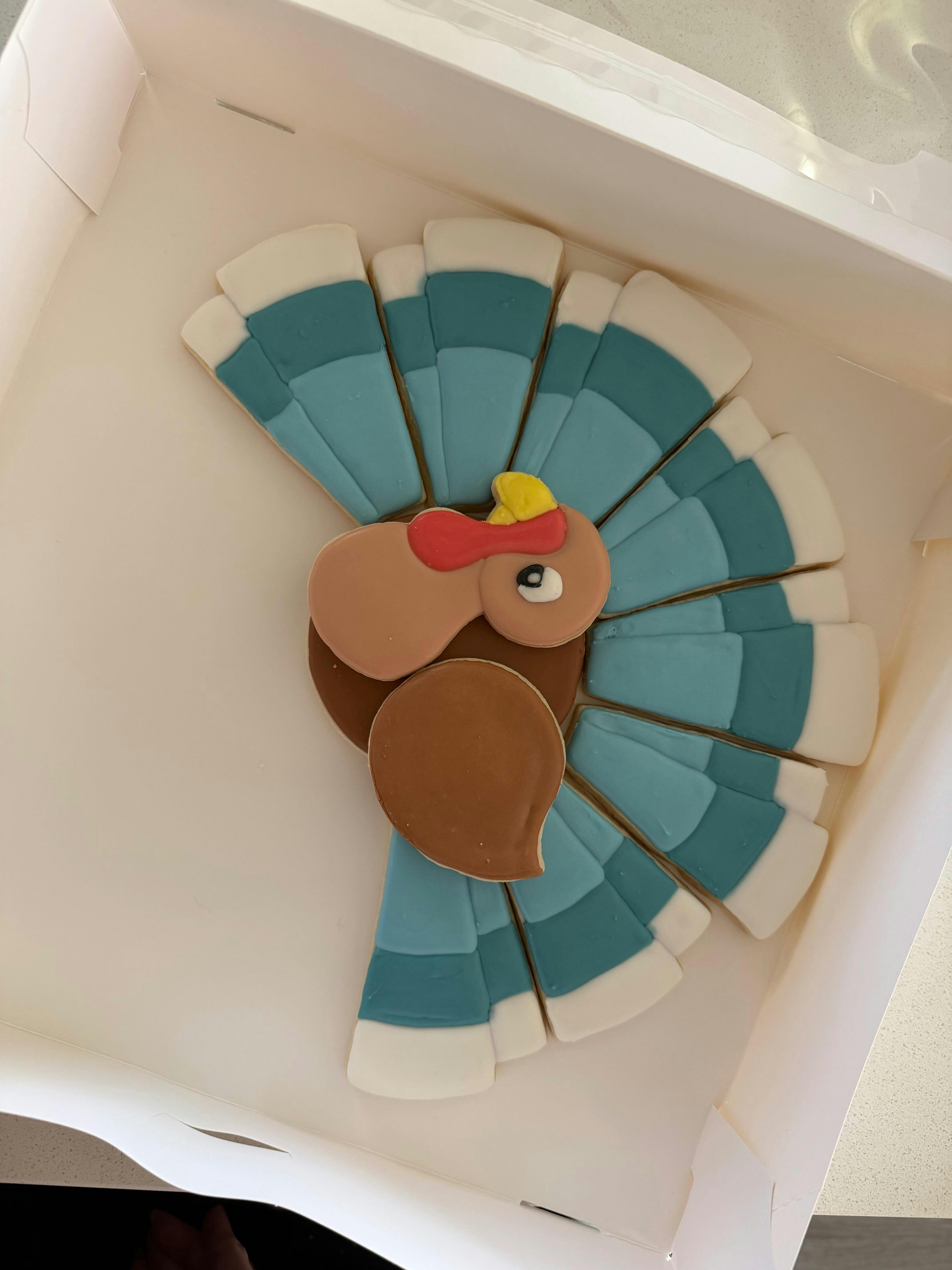 This Turkey Platter 4-Piece Cutter Set includes a turkey head and wing, a circle body and pleated feather cookie cutter.