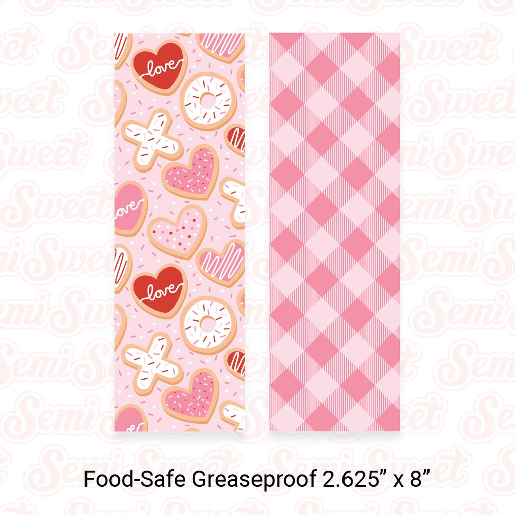 One side features a Valentine cookies pattern, while the reverse side is a pink gingham pattern — great for Valentine's Day treats.