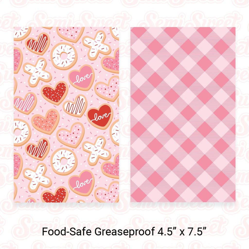 One side features a Valentine cookies pattern, while the reverse side is a pink gingham pattern — great for Valentine's Day treats.