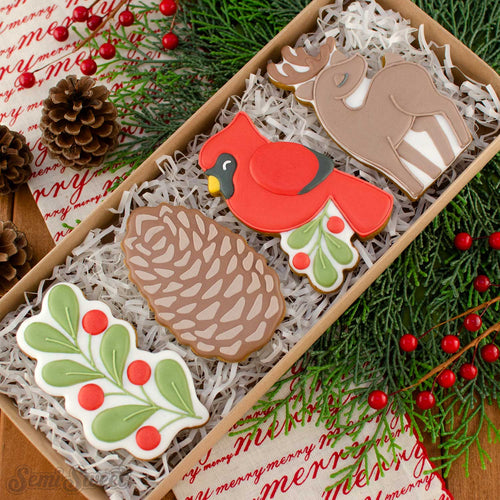 This Winter Woodland cookie cutter set includes 4 designs: a pine cone (coordinating stencil can be found here), a winter berry sprig, a cardinal, and a reindeer.