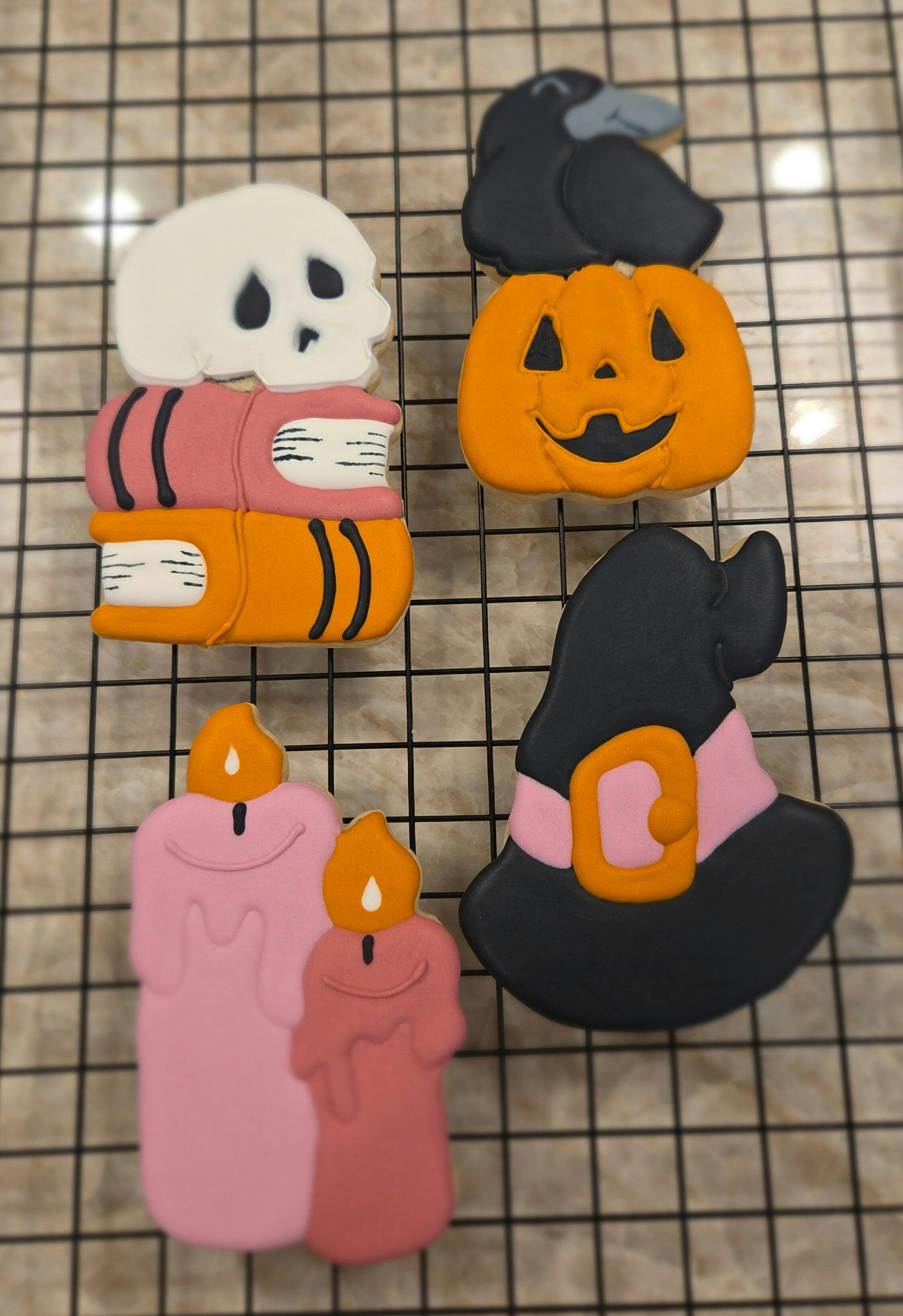 This Witch Kit cookie cutter set includes 4 designs: a double candle, a raven on pumpkin, a skull on books, and a thin witch hat.